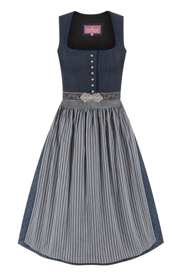 langes Dirndl in Dunkelblau und BlaugrauMieder im Tweed-Look mit Fischgrätmustereckiger Ausschnitt mit eleganter Samtbortedezent gemusterter Rock aus Baumwolleblaugraue Dirndlschürze mit traditionellem Rankenmustergewebtes Schürzenband mit Rosenmotivenantik verzierte Schürzenschließe in Altsilber
