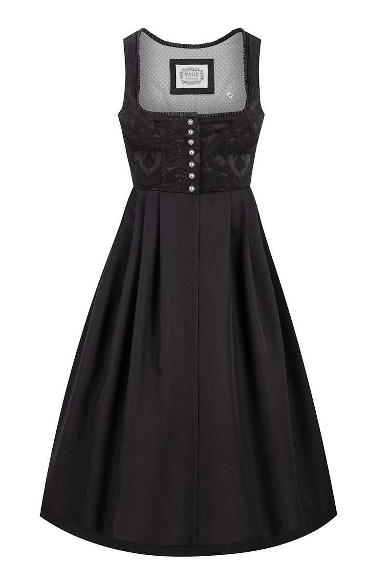 MOSER Dirndl lang 80 cm Gastro schwarz Amy Klassisch und traditionell: So präsentiert sich das MOSER Dirndl 80 cm »Amy« in Schwarz. Das Mieder ist mit einer zarten floralen Stickerei und Rüschenbordüre sowie Brustabnähern für optimalen Sitz versehen. Die silberfarbenen Zierknöpfe setzen einen angenehmen farblichen Kontrast. Der Rockteil schwingt durch die Kellerfalten weit und sorgt mit der Maxi-Länge für einen stilsicheren und eleganten Auftritt. Mit Pumps oder Trachtenstiefeln und Lodenjacke wird das Dirndl-Outfit komplett! Dirndl in Maxi-Länge Mieder aus Viskose-Baumwollmischung Rüschenborte und Blumenstickerei Knopfleiste aus silberfarbenen Zierknöpfen Brustabnäher Rockteil mit Kellerfalten