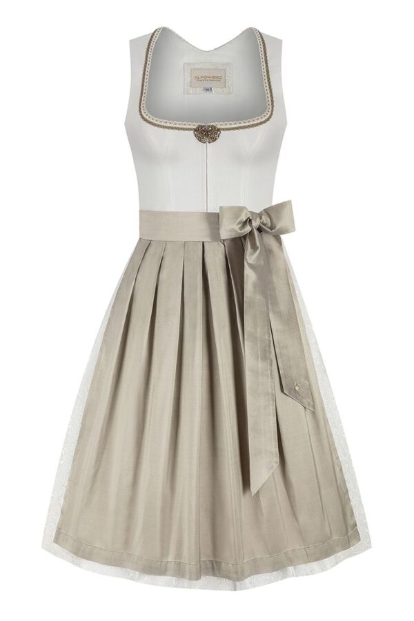 Alpenherz Brautdirndl midi 70 cm creme champagner Murielle cremefarbenes Hochzeitsdirndl aus edlem Material-MixMieder aus fein strukturiertem Baumwoll-Webstoffeckiger Ausschnitt mit filigranen Kordelbordürenverdeckter Reißverschluss vorn mit messingfarbener Schmuckschließegemusterter Rock aus 100 % Seideglänzende Seidenschürze