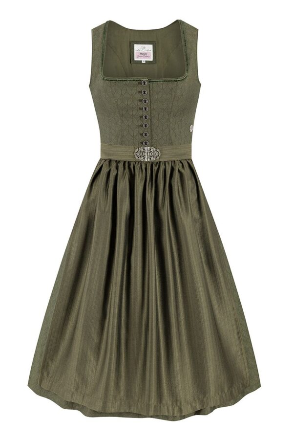 Dirndl CELINA (70 cm) olivfarbenes Midi Dirndl im Ton-in-Ton LookDirndl-Webstoff mit grafischem Musterelegante Samtborte am eckigen Ausschnittgrüne Trachtenknöpfe mit silberner UmrandungDirndlschürze mit filigranem Webmusterfloral verzierte Schürzenschließe in Altsilber
