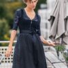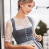 Dirndl CONNY (65 cm) mintfarbenes Midi Dirndl von MarJoMieder aus weichem Samtcordeckiger Ausschnitt mit silbernem Schmuck-Anhängerfloral gemusterter, dunkelgrüner Rockgetupfte Dirndlschürze mit glänzendem Satinband