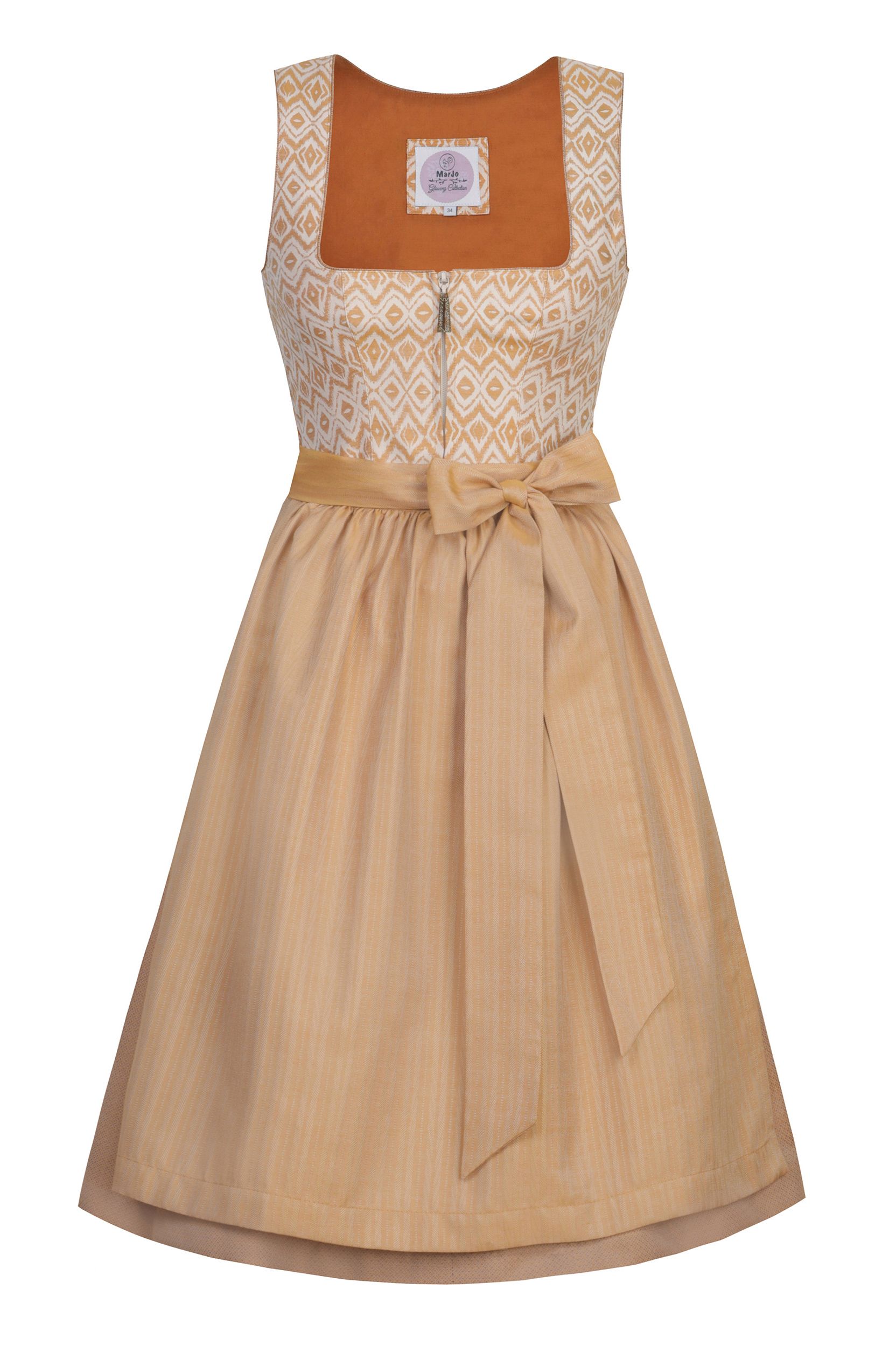 Midi Dirndl in hellen OrangetönenMieder mit trendigem Ethno-Musterschimmernder, dezent gemusterter RockTon-in-Ton Webschürze mit feinem Streifenmuster