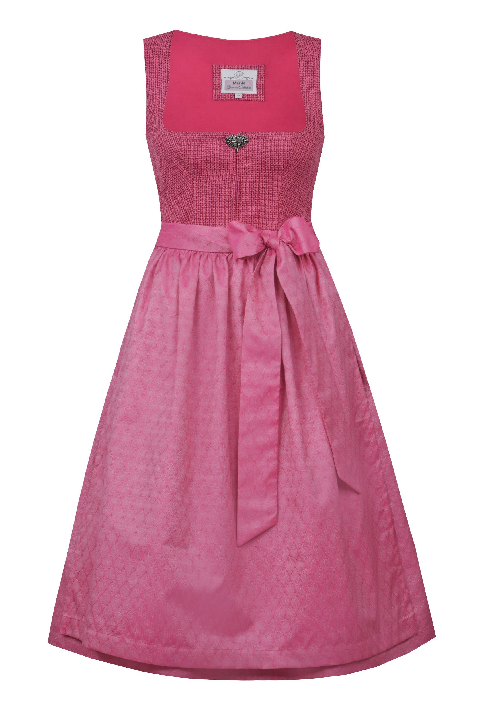Midi Dirndl in sommerlichem FuchsiaMieder aus trendigem Bouclé-Stoffeckiger Ausschnitt mit altsilberner Ornament-Broschefloral gemusterter Rockschimmernde Ton-in-Ton Webschürze