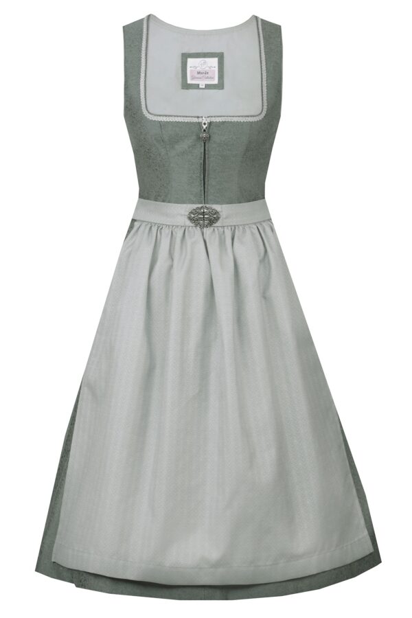 Dirndl SEßLACH begeistert im angesagten Ton-in-Ton Look in edlem Salbei. Der schimmernde Brokatstoff mit feinem Blumen- und Paisleymuster verleiht dem Midi Dirndl einen stilvollen Charakter. Der eckige Ausschnitt ist mit einer filigranen Kordelborte eingefasst und wird durch einen altsilbernen Zieranhänger charmant betont. Die zart gemusterte Schürze wird mit einer antik verzierten Schließe elegant geschlossen – ein Look, der moderne Zurückhaltung mit festlichem Glanz vereint. salbeifarbenes Midi Dirndl im stilvollen Ton-in-Ton Design glänzender Brokatstoff mit floralem Paisley-Muster eckiger Ausschnitt mit filigraner Kordelborte Zieranhänger in Altsilber am Dekolleté feine Dirndlschürze mit dezentem Muster antik verzierte Schürzenschließe Rocklänge: 70 cm