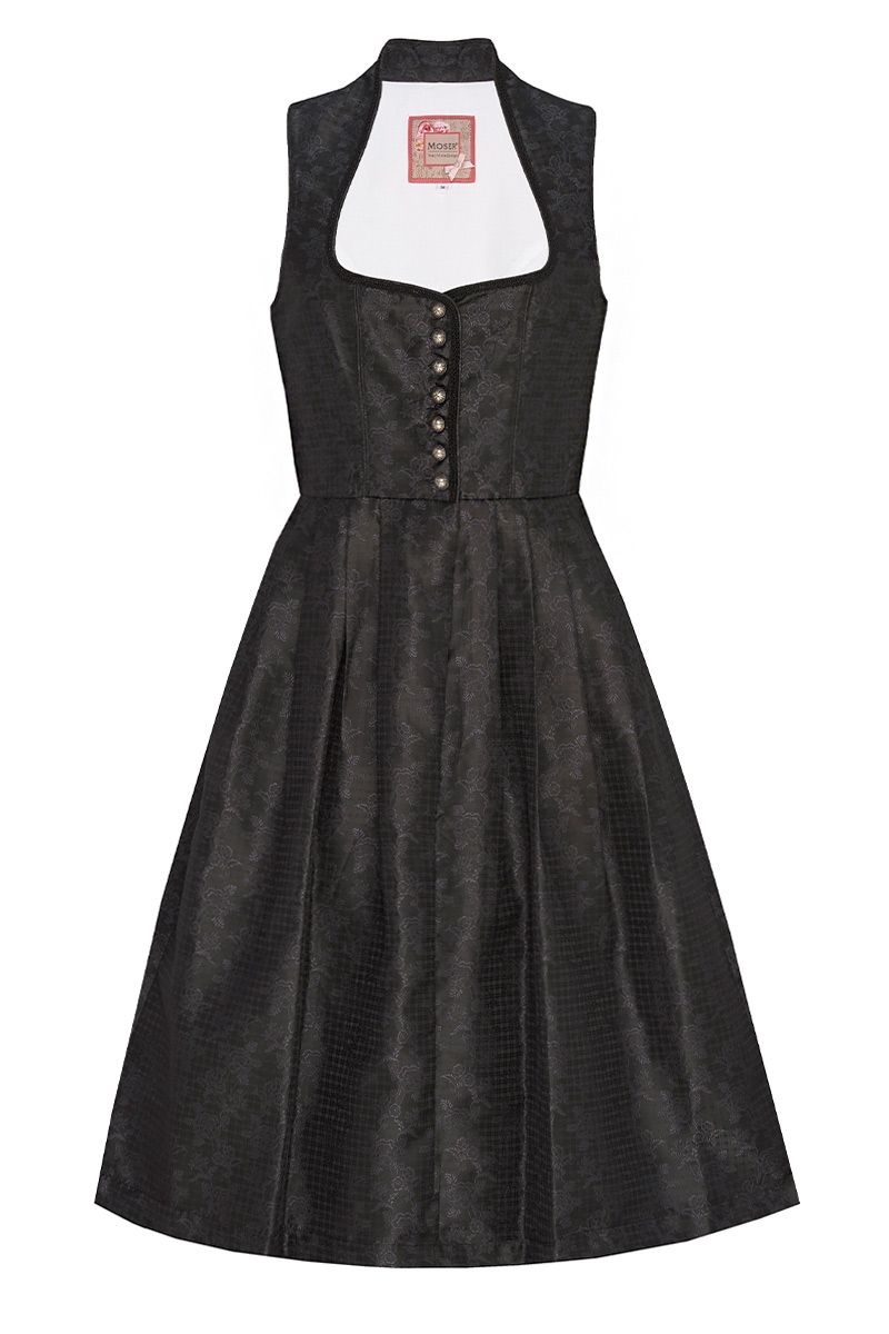 MOSER Trachtendesign Midi Dirndl Gastro schwarz Ronja schwarzes Gastro Dirndl in 70er Länge mit feinem Glanz Webstoff mit dezentem Karo- und Blumenmuster eleganter Stehkragen und Herzausschnitt mit schwarzer Kordelbordüre altsilberne Trachtenknöpfe mit spiralförmigem Muster ohne Dirndlschürze – mit vielen Farben und Mustern kombinierbar