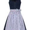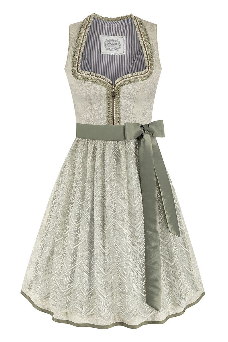 Dirndl SANDY (60 cm) Mini Dirndl in pastelligen SalbeitönenKleid aus Baumwolle mit filigranem Blumenmusterherzförmiger Ausschnitt mit prächtigen Zierborten und Rüschenhalbtransparente SpitzenschürzeSchürzenband aus glänzendem Taft