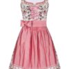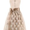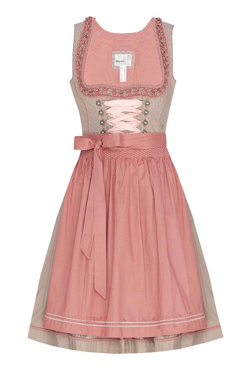 MarJo Mini Dirndl taupe koralle gepunktet Dana taupefarbenes Mini Dirndl in 55er Länge von MarJo weiß gemustertes Mieder mit kleinen Kleeblättern karreeförmiger Ausschnitt mit Froschgoscherl und Kordelbordüren altsilberne Miederösen in floraler Form Satinbandschnürung gepunkteter Rock in Taupe mit Kordelborte in Koralle korallfarbene, gepunktete Baumwollschürze mit Biesenfalten und Kordelbordüren am Saum