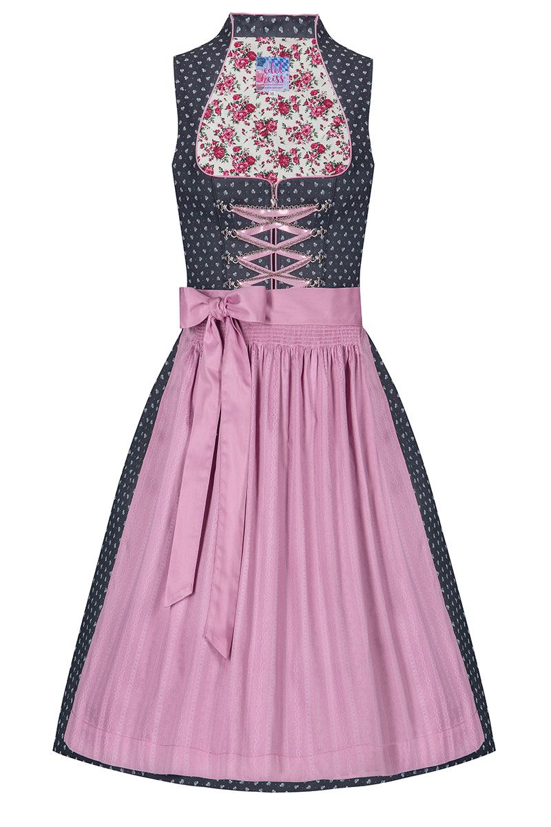 edelheiss Mini Dirndl anthrazit altrosa Nicol – limitiert Unser Dirndl Nicol in 60er Länge setzt auf Tradition! Das anthrazitfarbene Dirndl mit süßem Blumendruck wird mit einer altrosafarbenen Schürze aus Baumwolle kombiniert, die mit traditionellen Streifen und Blumenranken bedruckt ist. Am Mieder wurden als schöner Kontrast altrosafarbene Paspeln entlang des Stehkragens und des Reißverschlusses angebracht, die den Schnitt des Dirndls toll betonen. Die Schnürung kann nach Lust und Laune mit einem Satinband in Rosa und einer silbernen Kette variiert werden. Mini Dirndl in 60er Länge von edelheiss anthrazitfarbener Baumwollstoff mit weißem Blumenmuster Schürze in Altrosa mit traditionellem Rankenmuster und kleinen Pünktchen einfarbiges Schürzenband altrosafarbene Kontrastpaspel an Reißverschluss und Herzausschnitt silberner Herzanhänger und strassbesetzte Miederhaken Schnürung mit Satinband in Altrosa und silberner Kette
